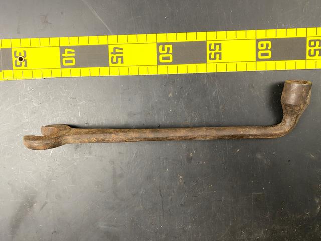 | The pointed handle of this spud wrench is used to align the holes in two pieces of metal, so you can drop a bolt through them. |