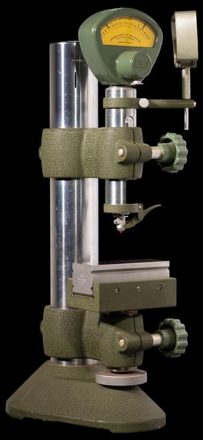 The pointer is just a drop of paint on a flattened section of the glass fiber. It must be so delicate! When the probe tip below is moved, the pointer end moves by about ten thousand times as much. In other words the “gear ratio” between movement of the tip and the pointer is about ten thousand to one. |