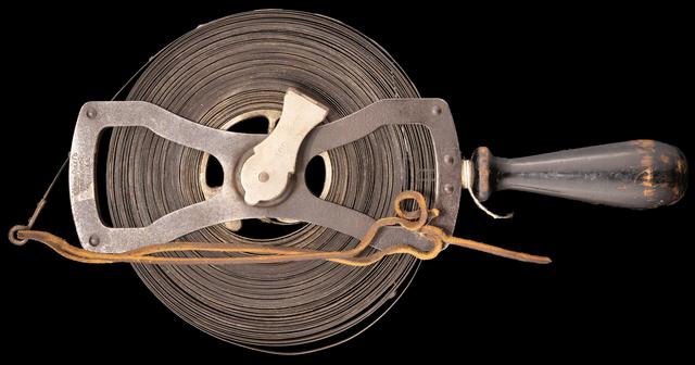 | The antique steel tape on the left has small metal markers brazed or soldered on, probably by hand, every foot. This keeps the tape itself strong and straight, while providing robust, stamped numbers counting out the feet. |