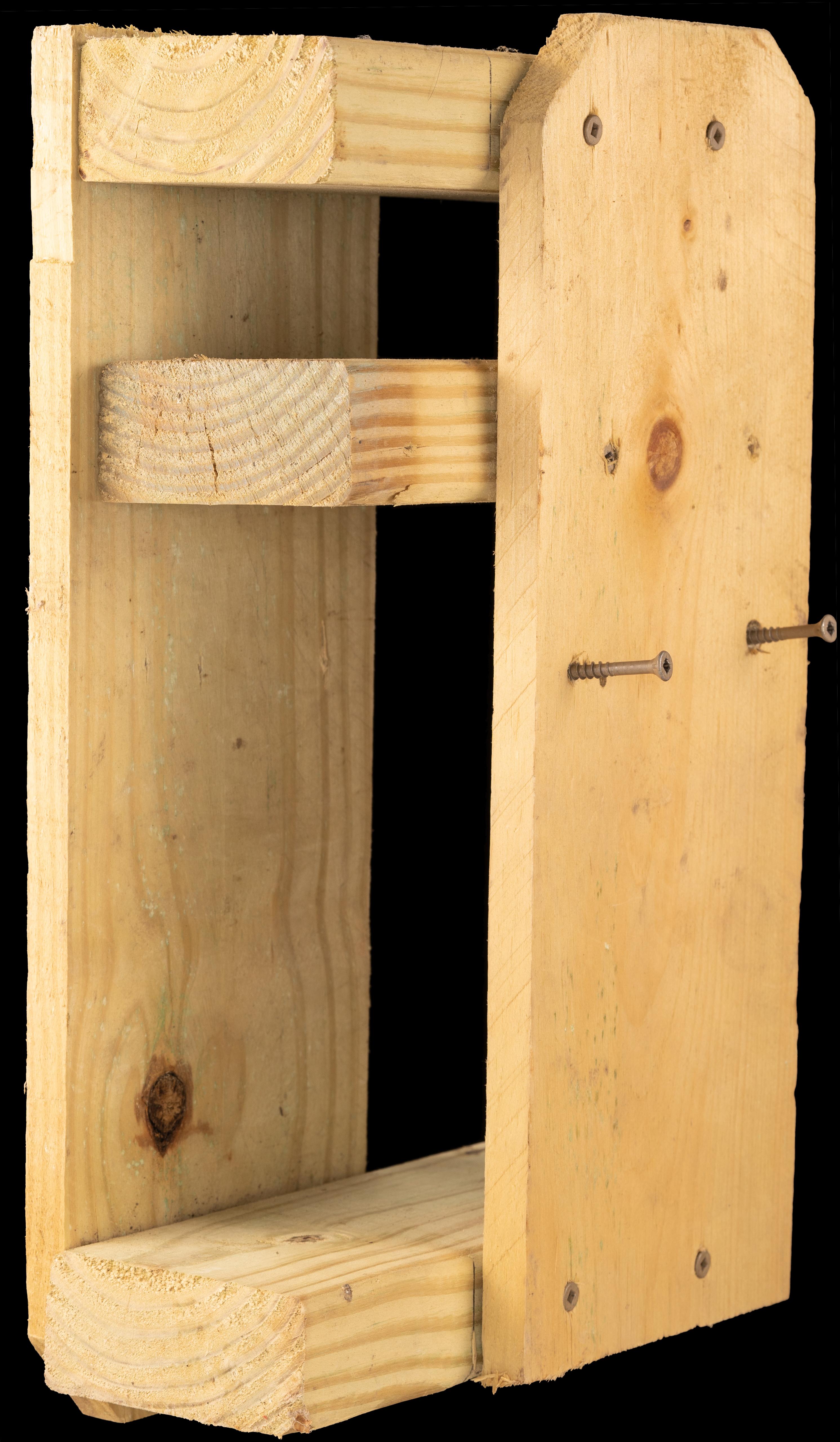 Each post in my fence required two cuts, one flat, and one at 45 degrees to form a bevel on one side. I made this double-sided jig to position the saw correctly for both cuts, one on each side. My only mistake was designing it so that it screwed to the top of the post, not the bottom. So after each post was finished, the jig and cut-off section came crashing down.