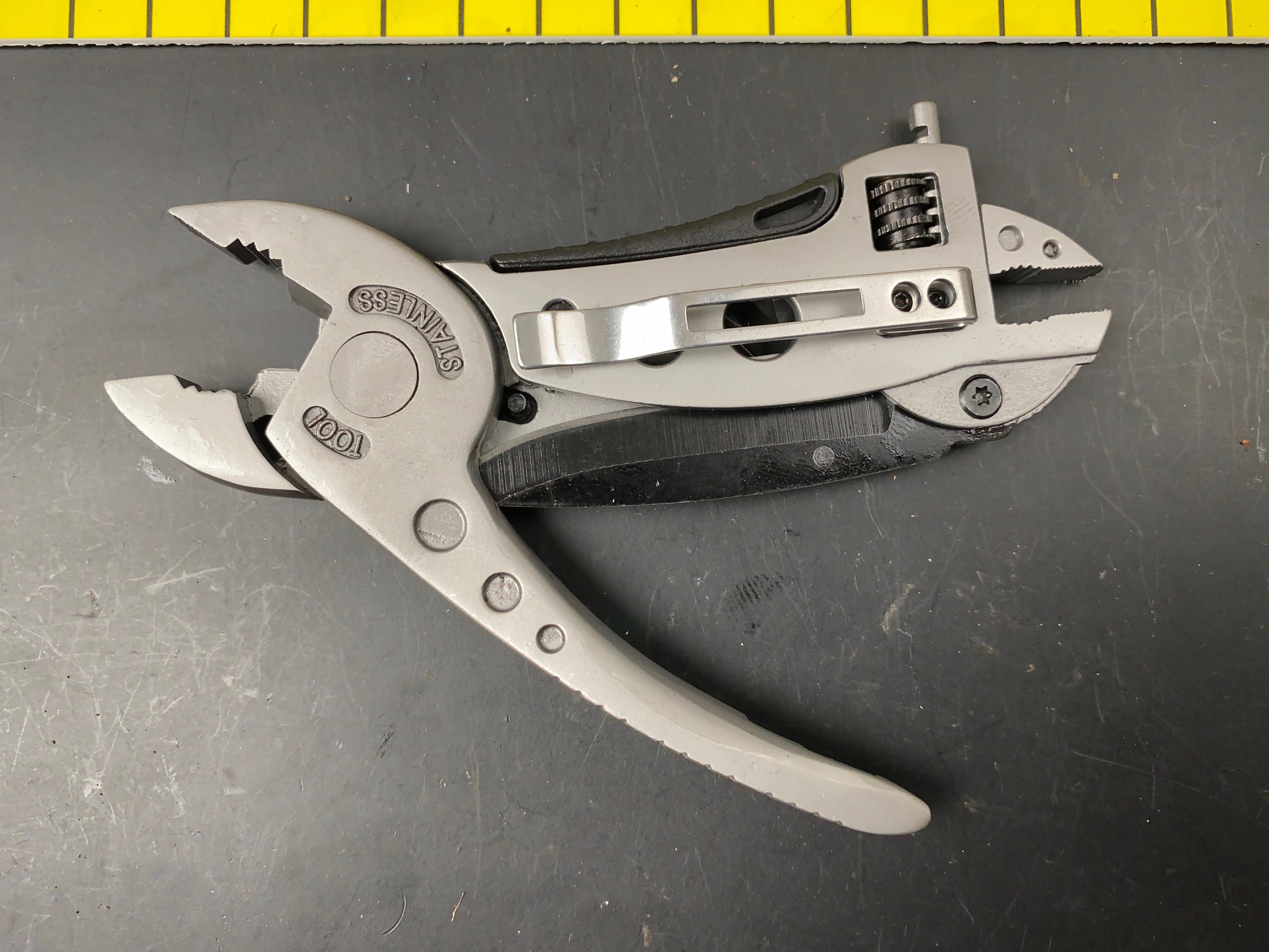 This modern contraption is a better-made, and more useful version of a combination pliers and crescent wrench. For one thing, the pliers lock shut, so they stay out of the way when using the wrench. It also has a knife and screwdriver set built in, and it’s pocket-sized. In other words, it’s a multi-tool with heavy emphasis on pliers and wrench.