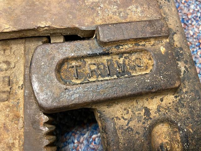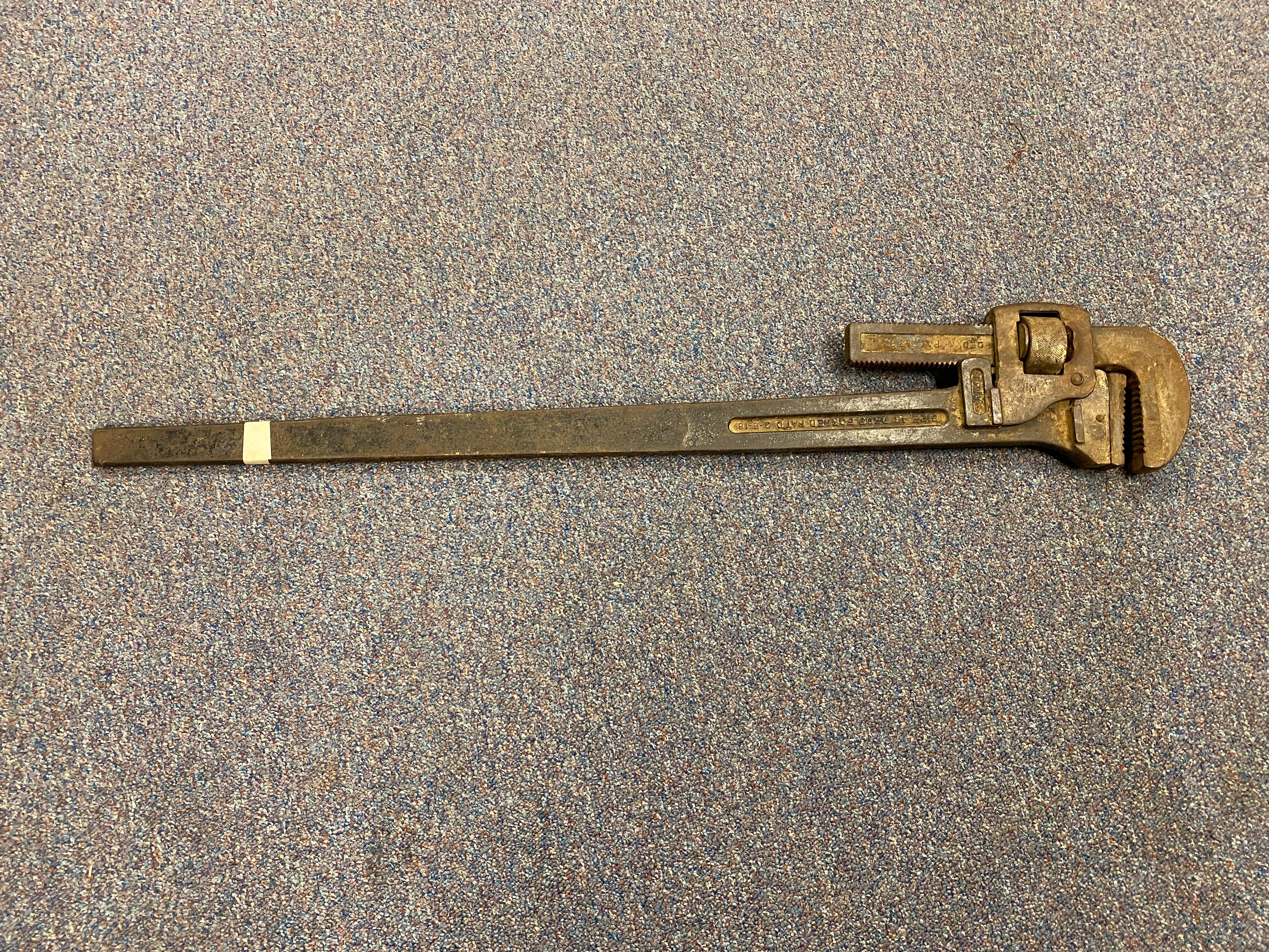 Weight was apparently not an issue for the people who made this 48-inch (1.2m) all-steel pipe wrench. You can see that the handle is meant to have another, even longer, piece of pipe slipped over it as a helper. Large diameter rusted pipe fittings can require an enormous amount of force to loosen, and this wrench can deliver it.